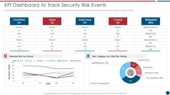 This slide displays KPI dashboard that company will use to track multiple risk events. Metrics covered in the dashboard are residual risks by period and risk category by total risk rating. Deliver and pitch your topic in the best possible manner with this IT Security Risk Management Approach Introduction Kpi Dashboard To Track Security Risk Events Icons PDF. Use them to share invaluable insights on System Technology Risk, Governance Risk, Security Risk Events and impress your audience. This template can be altered and modified as per your expectations. So, grab it now.
