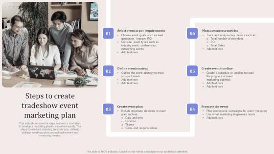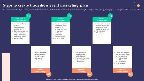 This slide showcases the steps involved by marketers to develop a marketing plan for tradeshow events. The steps covered are selecting the event type, defining strategy, creating a plan, promoting the event and measuring metrics. Slidegeeks is here to make your presentations a breeze with Steps To Create Tradeshow Event Marketing Plan Ideas PDF With our easy-to-use and customizable templates, you can focus on delivering your ideas rather than worrying about formatting. With a variety of designs to choose from, you are sure to find one that suits your needs. And with animations and unique photos, illustrations, and fonts, you can make your presentation pop. So whether you are giving a sales pitch or presenting to the board, make sure to check out Slidegeeks first