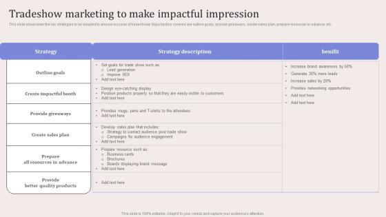 This slide showcases the key strategies to be adopted to ensure success of tradeshows. Major tactics covered are outline goals, provide giveaways, create sales plan, prepare resources in advance, etc. Get a simple yet stunning designed Tradeshow Marketing To Make Impactful Virtual Event Promotion To Capture Download Pdf. It is the best one to establish the tone in your meetings. It is an excellent way to make your presentations highly effective. So, download this PPT today from Slidegeeks and see the positive impacts. Our easy-to-edit Tradeshow Marketing To Make Impactful Virtual Event Promotion To Capture Download Pdf can be your go-to option for all upcoming conferences and meetings. So, what are you waiting for Grab this template today. This slide showcases the key strategies to be adopted to ensure success of tradeshows. Major tactics covered are outline goals, provide giveaways, create sales plan, prepare resources in advance, etc.
