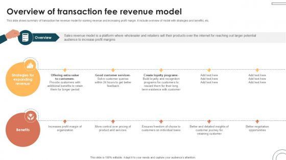 This slide shows summary of transaction fee revenue model for earning revenue and increasing profit margin. It include overview of model with strategies and benefits, etc. There are so many reasons you need a Overview Of Transaction Fee Internet Based Trade Structure Ppt Slide. The first reason is you can not spend time making everything from scratch, Thus, Slidegeeks has made presentation templates for you too. You can easily download these templates from our website easily. This slide shows summary of transaction fee revenue model for earning revenue and increasing profit margin. It include overview of model with strategies and benefits, etc.