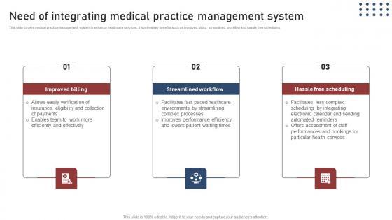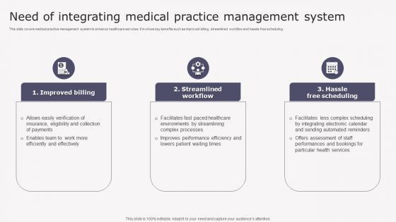 This slide covers medical practice management system to enhance healthcare services. It involves key benefits such as improved billing, streamlined workflow and hassle free scheduling. Presenting this PowerPoint presentation, titled Need Of Integrating Medical Transforming Medicare Services Using Health Mockup Pdf, with topics curated by our researchers after extensive research. This editable presentation is available for immediate download and provides attractive features when used. Download now and captivate your audience. Presenting this Need Of Integrating Medical Transforming Medicare Services Using Health Mockup Pdf. Our researchers have carefully researched and created these slides with all aspects taken into consideration. This is a completely customizable Need Of Integrating Medical Transforming Medicare Services Using Health Mockup Pdf that is available for immediate downloading. Download now and make an impact on your audience. Highlight the attractive features available with our PPTs. This slide covers medical practice management system to enhance healthcare services. It involves key benefits such as improved billing, streamlined workflow and hassle free scheduling.