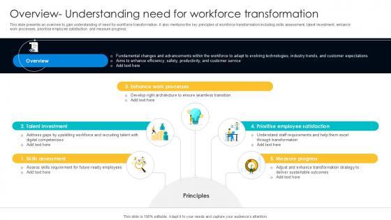 This slide presents an overview to gain understanding of need for workforce transformation. It also mentions the key principles of workforce transformation including skills assessment, talent investment, enhance work processes, prioritise employee satisfaction and measure progress. The best PPT templates are a great way to save time, energy, and resources. Slidegeeks have 100 percent editable powerpoint slides making them incredibly versatile. With these quality presentation templates, you can create a captivating and memorable presentation by combining visually appealing slides and effectively communicating your message. Download Measure Progress, Prioritise Employee Satisfaction, Enhance Work Processes from Slidegeeks and deliver a wonderful presentation. This slide presents an overview to gain understanding of need for workforce transformation. It also mentions the key principles of workforce transformation including skills assessment, talent investment, enhance work processes, prioritise employee satisfaction and measure progress.