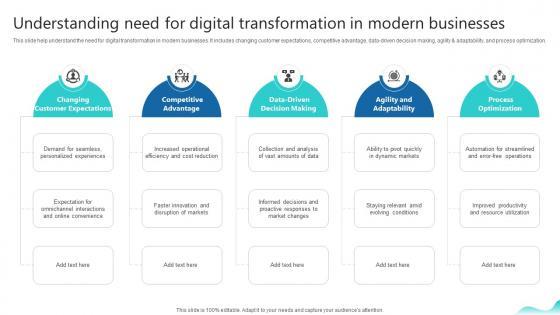 This slide help understand the need for digital transformation in modern businesses. It includes changing customer expectations, competitive advantage, data-driven decision making, agility and adaptability, and process optimization. From laying roadmaps to briefing everything in detail, our templates are perfect for you. You can set the stage with your presentation slides. All you have to do is download these easy-to-edit and customizable templates. Understanding Need For Digital Transformation In Modern Erp And Digital Transformation For Maximizing DT SS V will help you deliver an outstanding performance that everyone would remember and praise you for. Do download this presentation today. This slide help understand the need for digital transformation in modern businesses. It includes changing customer expectations, competitive advantage, data-driven decision making, agility and adaptability, and process optimization.