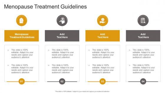 Introducing our well designed Menopause Treatment Guidelines In Powerpoint And Google Slides Cpb. This PowerPoint design presents information on topics like Menopause Treatment Guidelines. As it is predesigned it helps boost your confidence level. It also makes you a better presenter because of its high quality content and graphics. This PPT layout can be downloaded and used in different formats like PDF, PNG, and JPG. Not only this, it is available in both Standard Screen and Widescreen aspect ratios for your convenience. Therefore, click on the download button now to persuade and impress your audience. Our Menopause Treatment Guidelines In Powerpoint And Google Slides Cpb are topically designed to provide an attractive backdrop to any subject. Use them to look like a presentation pro.