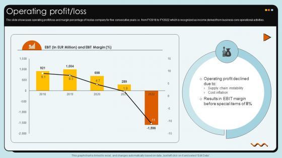 The slide showcases operating profit or loss and margin percentage of Vestas company for five consecutive years i.e. from FY2018 to FY2022 which is recognized as income derived from business core operational activities. Welcome to our selection of the Operating Profit Loss Wind Turbines Manufacturer Company Profile CP SS V. These are designed to help you showcase your creativity and bring your sphere to life. Planning and Innovation are essential for any business that is just starting out. This collection contains the designs that you need for your everyday presentations. All of our PowerPoints are 100 percent editable, so you can customize them to suit your needs. This multi-purpose template can be used in various situations. Grab these presentation templates today. The slide showcases operating profit or loss and margin percentage of Vestas company for five consecutive years i.e. from FY2018 to FY2022 which is recognized as income derived from business core operational activities.