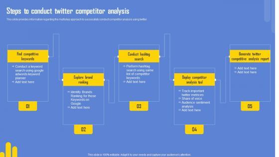 This slide provides information regarding the multistep approach to successfully conduct competitor analysis using twitter. Explore a selection of the finest Steps To Conduct Twitter Competitor Analysis Twitter Promotional Techniques Guidelines Pdf here. With a plethora of professionally designed and pre-made slide templates, you can quickly and easily find the right one for your upcoming presentation. You can use our to effectively convey your message to a wider audience. Slidegeeks has done a lot of research before preparing these presentation templates. The content can be personalized and the slides are highly editable. Grab templates today from Slidegeeks. This slide provides information regarding the multistep approach to successfully conduct competitor analysis using twitter.
