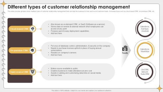 This slide provides glimpse about multiple types of customer relationship management that can help the business to track and record customer leads. It includes types such as cloud based CRM, on-premises CRM, etc. Are you in need of a template that can accommodate all of your creative concepts This one is crafted professionally and can be altered to fit any style. Use it with Google Slides or PowerPoint. Include striking photographs, symbols, depictions, and other visuals. Fill, move around, or remove text boxes as desired. Test out color palettes and font mixtures. Edit and save your work, or work with colleagues. Download Different Types Of Customer Planning Outreach Campaigns PPT Slide and observe how to make your presentation outstanding. Give an impeccable presentation to your group and make your presentation unforgettable. This slide provides glimpse about multiple types of customer relationship management that can help the business to track and record customer leads. It includes types such as cloud based CRM, on-premises CRM, etc.