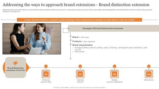 Mentioned slide shows information on brand distinction extension approach that can be used by companies to increase revenues. It also covers details about the application of brand distinction extension and provide an example related to same approach. Here you can discover an assortment of the finest PowerPoint and Google Slides templates. With these templates, you can create presentations for a variety of purposes while simultaneously providing your audience with an eye-catching visual experience. Download Addressing The Ways To Approach Brand Extensions Brand Ultimate Guide Implementing Rules Pdf to deliver an impeccable presentation. These templates will make your job of preparing presentations much quicker, yet still, maintain a high level of quality. Slidegeeks has experienced researchers who prepare these templates and write high-quality content for you. Later on, you can personalize the content by editing the Addressing The Ways To Approach Brand Extensions Brand Ultimate Guide Implementing Rules Pdf Mentioned slide shows information on brand distinction extension approach that can be used by companies to increase revenues. It also covers details about the application of brand distinction extension and provide an example related to same approach.