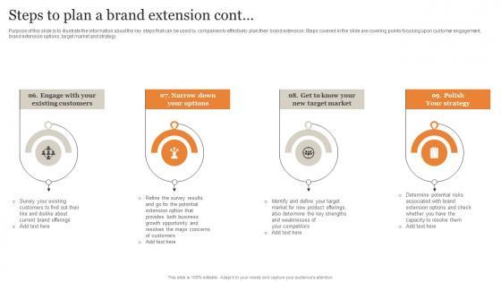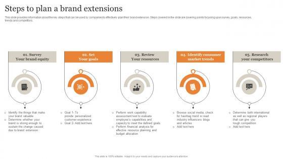 This slide provides information about the key steps that can be used by companies to effectively plan their brand extension. Steps covered in the slide are covering points focusing upon survey, goals, resources, trends and competitors. Create an editable Steps To Plan A Brand Extensions Ultimate Guide Implementing Template Pdf that communicates your idea and engages your audience. Whether you are presenting a business or an educational presentation, pre-designed presentation templates help save time. Steps To Plan A Brand Extensions Ultimate Guide Implementing Template Pdf is highly customizable and very easy to edit, covering many different styles from creative to business presentations. Slidegeeks has creative team members who have crafted amazing templates. So, go and get them without any delay. This slide provides information about the key steps that can be used by companies to effectively plan their brand extension. Steps covered in the slide are covering points focusing upon survey, goals, resources, trends and competitors.