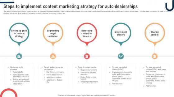 This slide covers process to deploy content strategy for automobile dealers and agents. The purpose of this template is to provide guide to be followed for implementing effective content to induce vehicle sales. It includes steps from setting up goals for content strategy, segmenting target audience, generating content for dealers, involvement of users, etc. Do you have to make sure that everyone on your team knows about any specific topic I yes, then you should give Ultimate Guide To Developing Steps To Implement Content Marketing Strategy For Auto Strategy SS V a try. Our experts have put a lot of knowledge and effort into creating this impeccable Ultimate Guide To Developing Steps To Implement Content Marketing Strategy For Auto Strategy SS V. You can use this template for your upcoming presentations, as the slides are perfect to represent even the tiniest detail. You can download these templates from the Slidegeeks website and these are easy to edit. So grab these today This slide covers process to deploy content strategy for automobile dealers and agents. The purpose of this template is to provide guide to be followed for implementing effective content to induce vehicle sales. It includes steps from setting up goals for content strategy, segmenting target audience, generating content for dealers, involvement of users, etc.