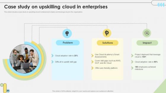 This slide includes a case study on upselling cloud in enterprises to deploy and leverage cloud in the organization. From laying roadmaps to briefing everything in detail, our templates are perfect for you. You can set the stage with your presentation slides. All you have to do is download these easy-to-edit and customizable templates. Workforce Competency Enhancement Case Study On Upskilling Cloud In Enterprises DTE SS V will help you deliver an outstanding performance that everyone would remember and praise you for. Do download this presentation today. This slide includes a case study on upselling cloud in enterprises to deploy and leverage cloud in the organization.