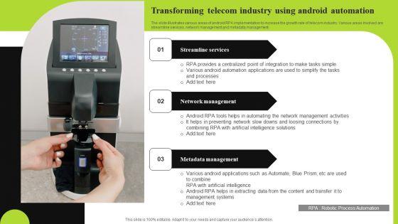The slide illustrates various areas of android RPA implementation to increase the growth rate of telecom industry. Various areas involved are streamline services, network management and metadata management Showcasing this set of slides titled Transforming Telecom Industry Using Android Automation Topics PDF. The topics addressed in these templates are Network Management, Streamline Services, Metadata Management. All the content presented in this PPT design is completely editable. Download it and make adjustments in color, background, font etc. as per your unique business setting.