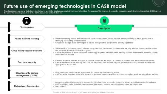 This slide gives an overview of the technologies that can be used in the cloud access security broker model in the future. The purpose of this slide is to showcase the various emerging technologies that can help CASB to grow in the future. The technologies include AI, ML, CSPM, data privacy and protection, etc. Want to ace your presentation in front of a live audience Our CASB 2 0 IT Future Use Of Emerging Technologies In CASB Model can help you do that by engaging all the users towards you. Slidegeeks experts have put their efforts and expertise into creating these impeccable powerpoint presentations so that you can communicate your ideas clearly. Moreover, all the templates are customizable, and easy-to-edit and downloadable. Use these for both personal and commercial use. This slide gives an overview of the technologies that can be used in the cloud access security broker model in the future. The purpose of this slide is to showcase the various emerging technologies that can help CASB to grow in the future. The technologies include AI, ML, CSPM, data privacy and protection, etc.