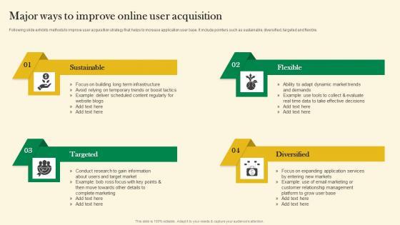Following slide exhibits methods to improve user acquisition strategy that helps to increase application user base. It include pointers such as sustainable, diversified, targeted and flexible. If your project calls for a presentation, then Slidegeeks is your go-to partner because we have professionally designed, easy-to-edit templates that are perfect for any presentation. After downloading, you can easily edit Major Ways To Improve Online User Acquisition Online Customer Acquisition Mockup Pdf and make the changes accordingly. You can rearrange slides or fill them with different images. Check out all the handy templates Following slide exhibits methods to improve user acquisition strategy that helps to increase application user base. It include pointers such as sustainable, diversified, targeted and flexible.