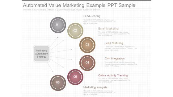 This is a automated value marketing example ppt sample. This is a six stage process. The stages in this process are lead scoring, email marketing, lead nurturing, crm integration, online activity tracking, marketing analysis.