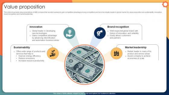 This slide showcases value propositions of ABB company that assists business to gain competitive advantage among competitors and become industry leader in global market. Its value proposition are sustainability, innovation, brand recognition and market leadership. Present like a pro with Value Proposition Engineering Solution Provider Company Profile CP SS V. Create beautiful presentations together with your team, using our easy-to-use presentation slides. Share your ideas in real-time and make changes on the fly by downloading our templates. So whether you are in the office, on the go, or in a remote location, you can stay in sync with your team and present your ideas with confidence. With Slidegeeks presentation got a whole lot easier. Grab these presentations today. This slide showcases value propositions of ABB company that assists business to gain competitive advantage among competitors and become industry leader in global market. Its value proposition are sustainability, innovation, brand recognition and market leadership.