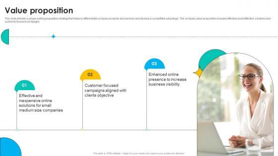 This slide exhibits a unique selling proposition strategy that helps to differentiate company products and services and develop a competitive advantage. The company value proposition includes effective and ineffective solutions and customer focused campaigns. Explore a selection of the finest Value Proposition Online Marketing Solutions Pitch Deck here. With a plethora of professionally designed and pre-made slide templates, you can quickly and easily find the right one for your upcoming presentation. You can use our Value Proposition Online Marketing Solutions Pitch Deck to effectively convey your message to a wider audience. Slidegeeks has done a lot of research before preparing these presentation templates. The content can be personalized and the slides are highly editable. Grab templates today from Slidegeeks. This slide exhibits a unique selling proposition strategy that helps to differentiate company products and services and develop a competitive advantage. The company value proposition includes effective and ineffective solutions and customer focused campaigns.