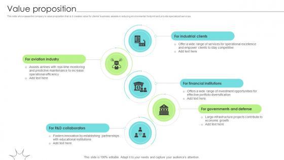 This slide showcases the companys value proposition that is it creates value for clients business, assists in reducing environmental footprint and provide specialized services. Are you in need of a template that can accommodate all of your creative concepts This one is crafted professionally and can be altered to fit any style. Use it with Google Slides or PowerPoint. Include striking photographs, symbols, depictions, and other visuals. Fill, move around, or remove text boxes as desired. Test out color palettes and font mixtures. Edit and save your work, or work with colleagues. Download Value Proposition Renewable Energy Solution Provider Business Model BMC SS V and observe how to make your presentation outstanding. Give an impeccable presentation to your group and make your presentation unforgettable. This slide showcases the companys value proposition that is it creates value for clients business, assists in reducing environmental footprint and provide specialized services.