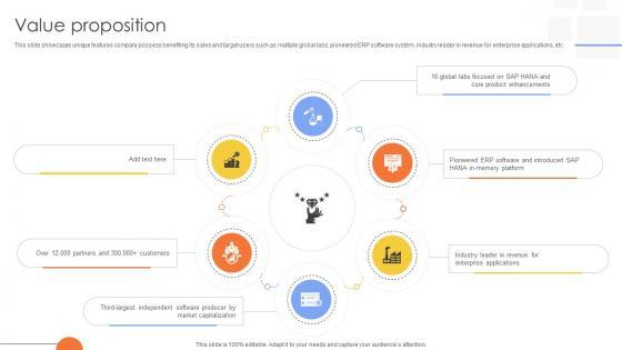 This slide showcases unique features company possess benefiting its sales and target users such as multiple global labs, pioneered ERP software system, industry leader in revenue for enterprise applications, etc. Are you in need of a template that can accommodate all of your creative concepts This one is crafted professionally and can be altered to fit any style. Use it with Google Slides or PowerPoint. Include striking photographs, symbols, depictions, and other visuals. Fill, move around, or remove text boxes as desired. Test out color palettes and font mixtures. Edit and save your work, or work with colleagues. Download Value Proposition Tech Solutions Provider Company Business Model BMC SS V and observe how to make your presentation outstanding. Give an impeccable presentation to your group and make your presentation unforgettable. This slide showcases unique features company possess benefiting its sales and target users such as multiple global labs, pioneered ERP software system, industry leader in revenue for enterprise applications, etc.