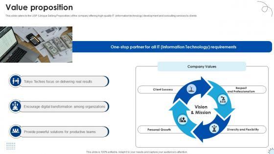This slide caters to the USP Unique Selling Proposition of the company offering high-quality IT information technology development and consulting services to clients. Explore a selection of the finest Value Proposition Technology Solutions Provider Investor Funding Elevator Pitch Deck here. With a plethora of professionally designed and pre-made slide templates, you can quickly and easily find the right one for your upcoming presentation. You can use our Value Proposition Technology Solutions Provider Investor Funding Elevator Pitch Deck to effectively convey your message to a wider audience. Slidegeeks has done a lot of research before preparing these presentation templates. The content can be personalized and the slides are highly editable. Grab templates today from Slidegeeks. This slide caters to the USP Unique Selling Proposition of the company offering high-quality IT information technology development and consulting services to clients.
