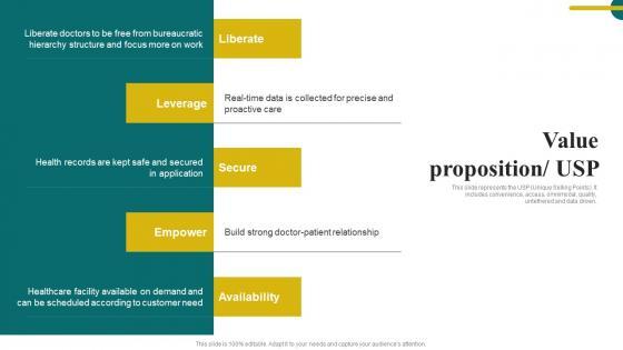 This slide represents the USP Unique Selling Points. It includes convenience, access, omnimodal, quality, untethered and data driven. Welcome to our selection of the Value Proposition Usp Digital Healthcare Solution Investor Funding Designs Pdf. These are designed to help you showcase your creativity and bring your sphere to life. Planning and Innovation are essential for any business that is just starting out. This collection contains the designs that you need for your everyday presentations. All of our PowerPoints are 100 percent editable, so you can customize them to suit your needs. This multi-purpose template can be used in various situations. Grab these presentation templates today This slide represents the USP Unique Selling Points. It includes convenience, access, omnimodal, quality, untethered and data driven.