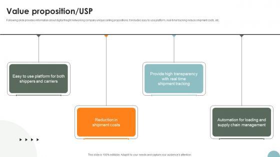 Following slide provides information about digital freight networking company unique selling propositions. It includes easy to use platform, real-time tracking reduce shipment costs, etc. Explore a selection of the finest Value Proposition USP Freight Management Solution Investor Funding Elevator Pitch Deck here. With a plethora of professionally designed and pre-made slide templates, you can quickly and easily find the right one for your upcoming presentation. You can use our Value Proposition USP Freight Management Solution Investor Funding Elevator Pitch Deck to effectively convey your message to a wider audience. Slidegeeks has done a lot of research before preparing these presentation templates. The content can be personalized and the slides are highly editable. Grab templates today from Slidegeeks. Following slide provides information about digital freight networking company unique selling propositions. It includes easy to use platform, real-time tracking reduce shipment costs, etc.