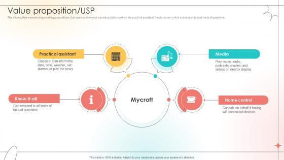 The slide outline several unique selling propositions of an open source voice assistant platform which are practical assistant, media, home control and responds to all kinds of questions. Explore a selection of the finest Value Proposition Usp Open Source Solution Investor Funding Elevator Pitch Deck here. With a plethora of professionally designed and pre-made slide templates, you can quickly and easily find the right one for your upcoming presentation. You can use our Value Proposition Usp Open Source Solution Investor Funding Elevator Pitch Deck to effectively convey your message to a wider audience. Slidegeeks has done a lot of research before preparing these presentation templates. The content can be personalized and the slides are highly editable. Grab templates today from Slidegeeks. The slide outline several unique selling propositions of an open source voice assistant platform which are practical assistant, media, home control and responds to all kinds of questions.