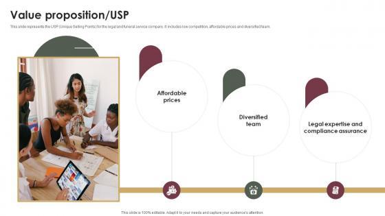 This slide represents the USP Unique Selling Points for the legal and funeral service company. It includes low competition, affordable prices and diversified team.Welcome to our selection of the Value Proposition Usp Probate Assistance Solutions Company Investor Funding Elevator Pitch Deck. These are designed to help you showcase your creativity and bring your sphere to life. Planning and Innovation are essential for any business that is just starting out. This collection contains the designs that you need for your everyday presentations. All of our PowerPoints are 100 percent editable, so you can customize them to suit your needs. This multi-purpose template can be used in various situations. Grab these presentation templates today. This slide represents the USP Unique Selling Points for the legal and funeral service company. It includes low competition, affordable prices and diversified team.