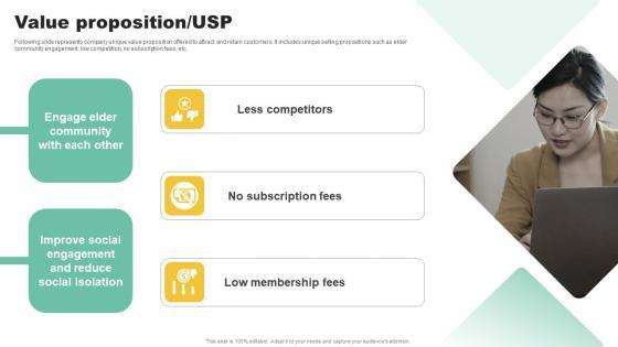 Following slide represents company unique value proposition offered to attract and retain customers. It includes unique selling propositions such as elder community engagement, low competition, no subscription fees, etc. Find highly impressive Value Proposition USP Social Community Management Solution Funding Pitch Presentation Information Pdf on Slidegeeks to deliver a meaningful presentation. You can save an ample amount of time using these presentation templates. No need to worry to prepare everything from scratch because Slidegeeks experts have already done a huge research and work for you. You need to download Value Proposition USP Social Community Management Solution Funding Pitch Presentation Information Pdf for your upcoming presentation. All the presentation templates are 100 percent editable and you can change the color and personalize the content accordingly. Download now Following slide represents company unique value proposition offered to attract and retain customers. It includes unique selling propositions such as elder community engagement, low competition, no subscription fees, etc.
