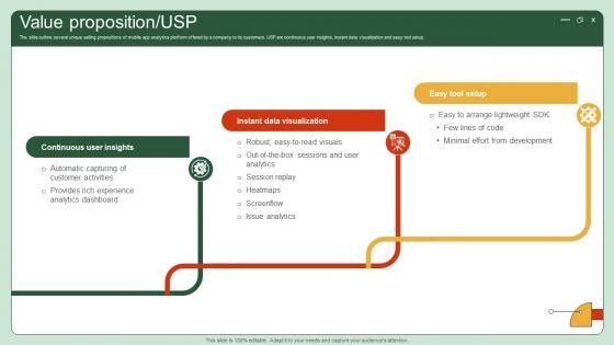 The slide outline several unique selling propositions of mobile app analytics platform offered by a company to its customers. USP are continuous user insights, instant data visualization and easy tool setup. Explore a selection of the finest Value Proposition Usp UI UX Enhancement Solution Investor Funding Elevator Pitch Deck here. With a plethora of professionally designed and pre-made slide templates, you can quickly and easily find the right one for your upcoming presentation. You can use our Value Proposition Usp UI UX Enhancement Solution Investor Funding Elevator Pitch Deck to effectively convey your message to a wider audience. Slidegeeks has done a lot of research before preparing these presentation templates. The content can be personalized and the slides are highly editable. Grab templates today from Slidegeeks. The slide outline several unique selling propositions of mobile app analytics platform offered by a company to its customers. USP are continuous user insights, instant data visualization and easy tool setup.