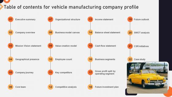 This Table Of Contents For Vehicle Manufacturing Company Profile CP SS V is perfect for any presentation, be it in front of clients or colleagues. It is a versatile and stylish solution for organizing your meetings. The Table Of Contents For Vehicle Manufacturing Company Profile CP SS V features a modern design for your presentation meetings. The adjustable and customizable slides provide unlimited possibilities for acing up your presentation. Slidegeeks has done all the homework before launching the product for you. So, do not wait, grab the presentation templates today Our Table Of Contents For Vehicle Manufacturing Company Profile CP SS V are topically designed to provide an attractive backdrop to any subject. Use them to look like a presentation pro.