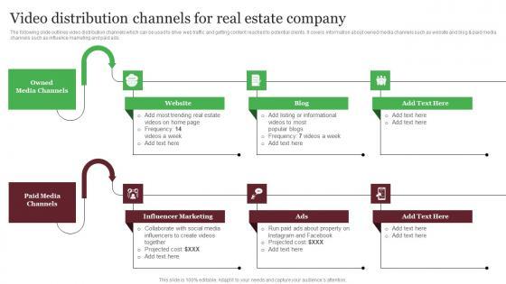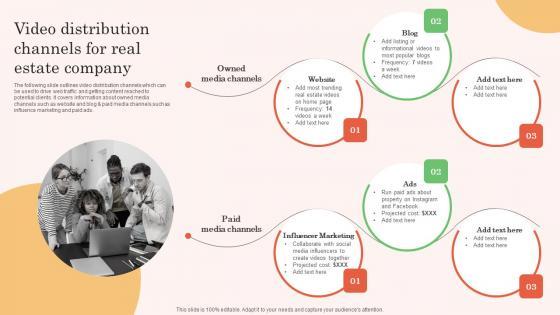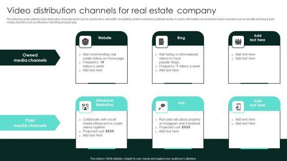 The following slide outlines video distribution channels which can be used to drive web traffic and getting content reached to potential clients. It covers information about owned media channels such as website and blog and paid media channels such as influence marketing and paid ads. Here you can discover an assortment of the finest PowerPoint and Google Slides templates. With these templates, you can create presentations for a variety of purposes while simultaneously providing your audience with an eye-catching visual experience. Download Video Distribution Channels For Real Estate Company Strategic Real Estate Infographics Pdf to deliver an impeccable presentation. These templates will make your job of preparing presentations much quicker, yet still, maintain a high level of quality. Slidegeeks has experienced researchers who prepare these templates and write high-quality content for you. Later on, you can personalize the content by editing the Video Distribution Channels For Real Estate Company Strategic Real Estate Infographics Pdf The following slide outlines video distribution channels which can be used to drive web traffic and getting content reached to potential clients. It covers information about owned media channels such as website and blog and paid media channels such as influence marketing and paid ads.