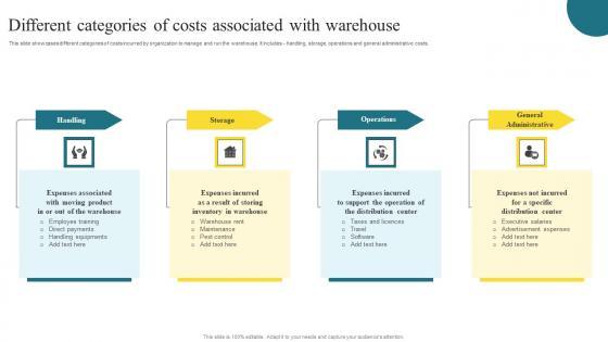 This slide showcases different categories of costs incurred by organization to manage and run the warehouse. It includes - handling, storage, operations and general administrative costs. Create an editable Adopting Multiple Tactics To Improve Inventory Optimization Different Categories Of Costs Associated With Warehouse Formats PDF that communicates your idea and engages your audience. Whether youre presenting a business or an educational presentation, pre designed presentation templates help save time. Adopting Multiple Tactics To Improve Inventory Optimization Different Categories Of Costs Associated With Warehouse Formats PDF is highly customizable and very easy to edit, covering many different styles from creative to business presentations. Slidegeeks has creative team members who have crafted amazing templates. So, go and get them without any delay.