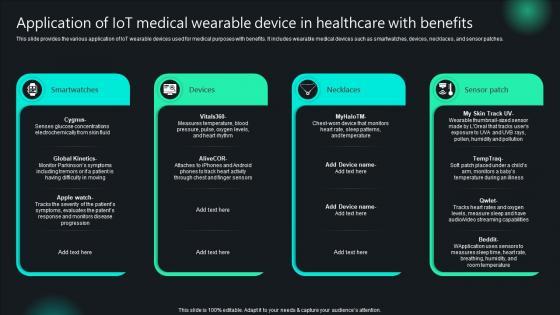 This slide provides the various application of IoT wearable devices used for medical purposes with benefits. It includes wearable medical devices such as smartwatches, devices, necklaces, and sensor patches. Create an editable Application Of IoT Medical Wearable Device In Healthcare Unlocking Potential IoTs Application IoT SS V that communicates your idea and engages your audience. Whether you are presenting a business or an educational presentation, pre-designed presentation templates help save time. Application Of IoT Medical Wearable Device In Healthcare Unlocking Potential IoTs Application IoT SS V is highly customizable and very easy to edit, covering many different styles from creative to business presentations. Slidegeeks has creative team members who have crafted amazing templates. So, go and get them without any delay. This slide provides the various application of IoT wearable devices used for medical purposes with benefits. It includes wearable medical devices such as smartwatches, devices, necklaces, and sensor patches.