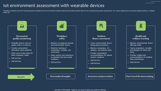 This slide provides the use of IoT technology based wearable devices for environment condition monitoring that collects real-time data from surrounding and generates required action. The various categories are personal air quality monitoring, workplace safety, etc. Showcasing this set of slides titled IOT Environment Assessment With Wearable Devices Elements Pdf The topics addressed in these templates are Quality Monitoring, Workplace Safety, Fitness Assessment All the content presented in this PPT design is completely editable. Download it and make adjustments in color, background, font etc. as per your unique business setting. This slide provides the use of IoT technology based wearable devices for environment condition monitoring that collects real-time data from surrounding and generates required action. The various categories are personal air quality monitoring, workplace safety, etc.