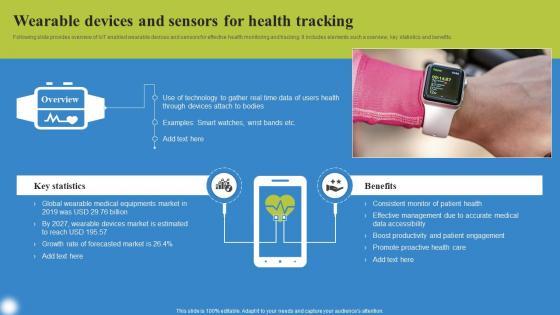 Following slide provides overview of IoT enabled wearable devices and sensors for effective health monitoring and tracking. It includes elements such a overview, key statistics and benefits. From laying roadmaps to briefing everything in detail, our templates are perfect for you. You can set the stage with your presentation slides. All you have to do is download these easy to edit and customizable templates. Wearable Devices And Sensors Deploying IoT Solutions For Enhanced Healthcare Pictures Pdf will help you deliver an outstanding performance that everyone would remember and praise you for. Do download this presentation today. Following slide provides overview of IoT enabled wearable devices and sensors for effective health monitoring and tracking. It includes elements such a overview, key statistics and benefits.