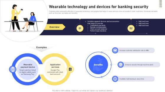 Following slide represents utilization of wearable technology and gadgets that helps to make services more accessible to bank customers. It includes elements such as overview, examples and benefits. Create an editable Wearable Technology And Devices For Banking Security IoT In Banking For Digital Future IoT SS V that communicates your idea and engages your audience. Whether you are presenting a business or an educational presentation, pre-designed presentation templates help save time. Wearable Technology And Devices For Banking Security IoT In Banking For Digital Future IoT SS V is highly customizable and very easy to edit, covering many different styles from creative to business presentations. Slidegeeks has creative team members who have crafted amazing templates. So, go and get them without any delay. Following slide represents utilization of wearable technology and gadgets that helps to make services more accessible to bank customers. It includes elements such as overview, examples and benefits.