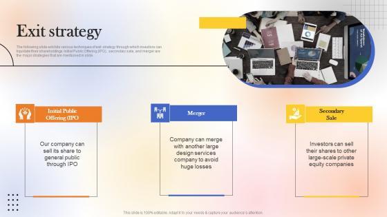 Following slide provides insights into most feasible ways for investors to exit from the investment in the company. It includes strategies such as mergers and acquisition, IPO etc. There are so many reasons you need a Web Designing Icon Investor Funding Elevator Pitch Deck Exit Strategy Formats PDF. The first reason is you cannot spend time making everything from scratch, Thus, Slidegeeks has made presentation templates for you too. You can easily download these templates from our website easily.
