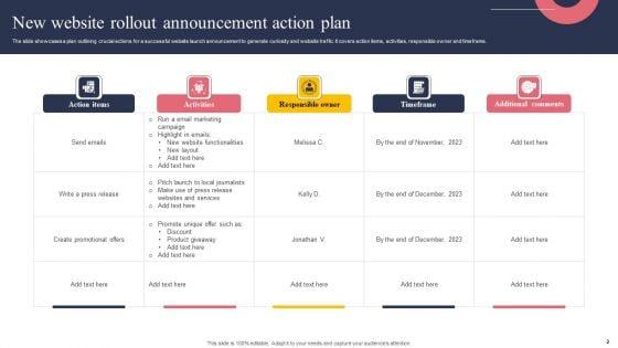 The slide showcases a plan outlining crucial actions for a successful website launch announcement to generate curiosity and website traffic. It covers action items, activities, responsible owner and timeframe. Showcasing this set of slides titled New Website Rollout Announcement Action Plan Portrait PDF. The topics addressed in these templates are Email Marketing, Websites And Services, Responsible Owner. All the content presented in this PPT design is completely editable. Download it and make adjustments in color, background, font etc. as per your unique business setting.