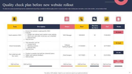 The slide showcases essential things must be completed before launching a website for effective quality control. It covers an outline of plan including task, description, owner, start, duration , end and status of task. Showcasing this set of slides titled Quality Check Plan Before New Website Rollout Sample PDF. The topics addressed in these templates are SEO Manager, Web Designer, Elements. All the content presented in this PPT design is completely editable. Download it and make adjustments in color, background, font etc. as per your unique business setting.