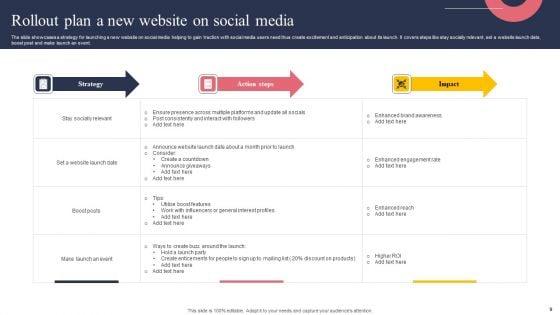 The slide showcases a strategy for launching a new website on social media helping to gain traction with social media users need thus create excitement and anticipation about its launch. It covers steps like stay socially relevant, set a website launch date, boost post and make launch an event. Showcasing this set of slides titled Rollout Plan A New Website On Social Media Inspiration PDF. The topics addressed in these templates are Enhanced Brand Awareness, Enhanced Engagement Rate, Social Media. All the content presented in this PPT design is completely editable. Download it and make adjustments in color, background, font etc. as per your unique business setting.