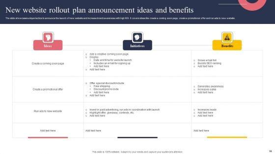 If designing a presentation takes a lot of your time and resources and you are looking for a better alternative, then this Website Rollout Plan Ppt PowerPoint Presentation Complete Deck With Slides is the right fit for you. This is a prefabricated set that can help you deliver a great presentation on the topic. All the seventeen slides included in this sample template can be used to present a birds-eye view of the topic. These slides are also fully editable, giving you enough freedom to add specific details to make this layout more suited to your business setting. Apart from the content, all other elements like color, design, theme are also replaceable and editable. This helps in designing a variety of presentations with a single layout. Not only this, you can use this PPT design in formats like PDF, PNG, and JPG once downloaded. Therefore, without any further ado, download and utilize this sample presentation as per your liking.