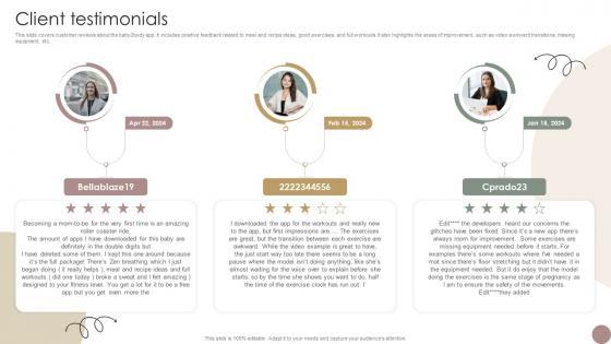 This slide covers customer reviews about the baby2body app. It includes positive feedback related to meal and recipe ideas, good exercises, and full workouts. It also highlights the areas of improvement, such as video awkward transitions, missing equipment, etc. Create an editable Client Testimonials Women Wellness Coaching Platform Pitch Deck that communicates your idea and engages your audience. Whether you are presenting a business or an educational presentation, pre-designed presentation templates help save time. Client Testimonials Women Wellness Coaching Platform Pitch Deck is highly customizable and very easy to edit, covering many different styles from creative to business presentations. Slidegeeks has creative team members who have crafted amazing templates. So, go and get them without any delay. This slide covers customer reviews about the baby2body app. It includes positive feedback related to meal and recipe ideas, good exercises, and full workouts. It also highlights the areas of improvement, such as video awkward transitions, missing equipment, etc.