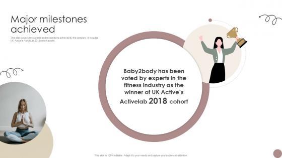 This slide covers key awards and recognitions achieved by the company. It includes UK Actives ActiveLab 2018 cohort award. If your project calls for a presentation, then Slidegeeks is your go-to partner because we have professionally designed, easy-to-edit templates that are perfect for any presentation. After downloading, you can easily edit Major Milestones Achieved Women Wellness Coaching Platform Pitch Deck and make the changes accordingly. You can rearrange slides or fill them with different images. Check out all the handy templates This slide covers key awards and recognitions achieved by the company. It includes UK Actives ActiveLab 2018 cohort award.