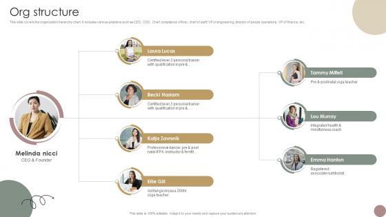 This slide covers the organization hierarchy chart. It includes various positions such as CEO, COO, Chief compliance officer, chief of staff, VP of engineering, director of people operations, VP of finance, etc. Are you in need of a template that can accommodate all of your creative concepts This one is crafted professionally and can be altered to fit any style. Use it with Google Slides or PowerPoint. Include striking photographs, symbols, depictions, and other visuals. Fill, move around, or remove text boxes as desired. Test out color palettes and font mixtures. Edit and save your work, or work with colleagues. Download Org Structure Women Wellness Coaching Platform Pitch Deck and observe how to make your presentation outstanding. Give an impeccable presentation to your group and make your presentation unforgettable. This slide covers the organization hierarchy chart. It includes various positions such as CEO, COO, Chief compliance officer, chief of staff, VP of engineering, director of people operations, VP of finance, etc.