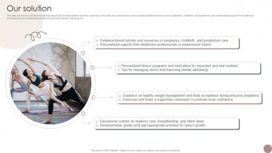 This slide covers key solutions provided by baby2body for the problems faced by customers. It includes services such as evidence-based articles and resources on pregnancy, childbirth, and postpartum care, personalized support from healthcare professionals, tips for managing stress and improving mental well-being, etc. Crafting an eye-catching presentation has never been more straightforward. Let your presentation shine with this tasteful yet straightforward Our Solution Women Wellness Coaching Platform Pitch Deck template. It offers a minimalistic and classy look that is great for making a statement. The colors have been employed intelligently to add a bit of playfulness while still remaining professional. Construct the ideal Our Solution Women Wellness Coaching Platform Pitch Deck that effortlessly grabs the attention of your audience Begin now and be certain to wow your customers This slide covers key solutions provided by baby2body for the problems faced by customers. It includes services such as evidence-based articles and resources on pregnancy, childbirth, and postpartum care, personalized support from healthcare professionals, tips for managing stress and improving mental well-being, etc.