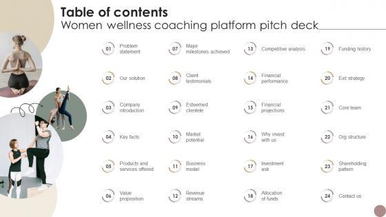 This Table Of Contents Women Wellness Coaching Platform Pitch Deck is perfect for any presentation, be it in front of clients or colleagues. It is a versatile and stylish solution for organizing your meetings. The Table Of Contents Women Wellness Coaching Platform Pitch Deck features a modern design for your presentation meetings. The adjustable and customizable slides provide unlimited possibilities for acing up your presentation. Slidegeeks has done all the homework before launching the product for you. So, do not wait, grab the presentation templates today Our Table Of Contents Women Wellness Coaching Platform Pitch Deck are topically designed to provide an attractive backdrop to any subject. Use them to look like a presentation pro.
