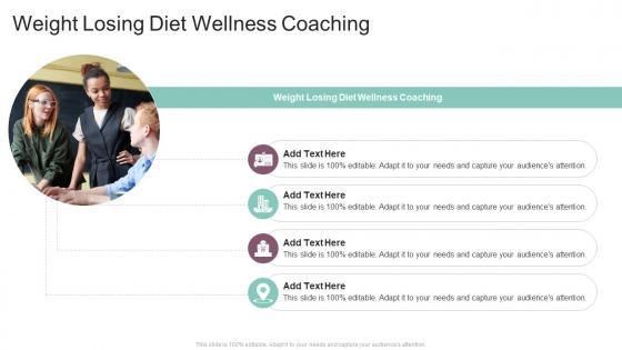 Introducing our well designed Weight Losing Diet Wellness Coaching In Powerpoint And Google Slides Cpb. This PowerPoint design presents information on topics like Weight Losing Diet Wellness Coaching. As it is predesigned it helps boost your confidence level. It also makes you a better presenter because of its high quality content and graphics. This PPT layout can be downloaded and used in different formats like PDF, PNG, and JPG. Not only this, it is available in both Standard Screen and Widescreen aspect ratios for your convenience. Therefore, click on the download button now to persuade and impress your audience. Our Weight Losing Diet Wellness Coaching In Powerpoint And Google Slides Cpb are topically designed to provide an attractive backdrop to any subject. Use them to look like a presentation pro.