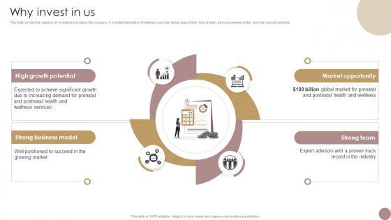 This slide covers the reasons for investors to invest in the company. It includes benefits of investment such as market opportunity, strong team, strong business model, and high growth potential. Explore a selection of the finest Why Invest In Us Women Wellness Coaching Platform Pitch Deck here. With a plethora of professionally designed and pre-made slide templates, you can quickly and easily find the right one for your upcoming presentation. You can use our Why Invest In Us Women Wellness Coaching Platform Pitch Deck to effectively convey your message to a wider audience. Slidegeeks has done a lot of research before preparing these presentation templates. The content can be personalized and the slides are highly editable. Grab templates today from Slidegeeks. This slide covers the reasons for investors to invest in the company. It includes benefits of investment such as market opportunity, strong team, strong business model, and high growth potential.