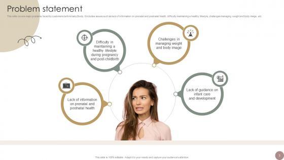 This slide covers major problems faced by customers before baby2body. It includes issues such as lack of information on prenatal and postnatal health, difficulty maintaining a healthy lifestyle, challenges managing weight and body image, etc. Make sure to capture your audiences attention in your business displays with our gratis customizable Problem Statement Women Wellness Coaching Platform Pitch Deck. These are great for business strategies, office conferences, capital raising or task suggestions. If you desire to acquire more customers for your tech business and ensure they stay satisfied, create your own sales presentation with these plain slides. This slide covers major problems faced by customers before baby2body. It includes issues such as lack of information on prenatal and postnatal health, difficulty maintaining a healthy lifestyle, challenges managing weight and body image, etc.